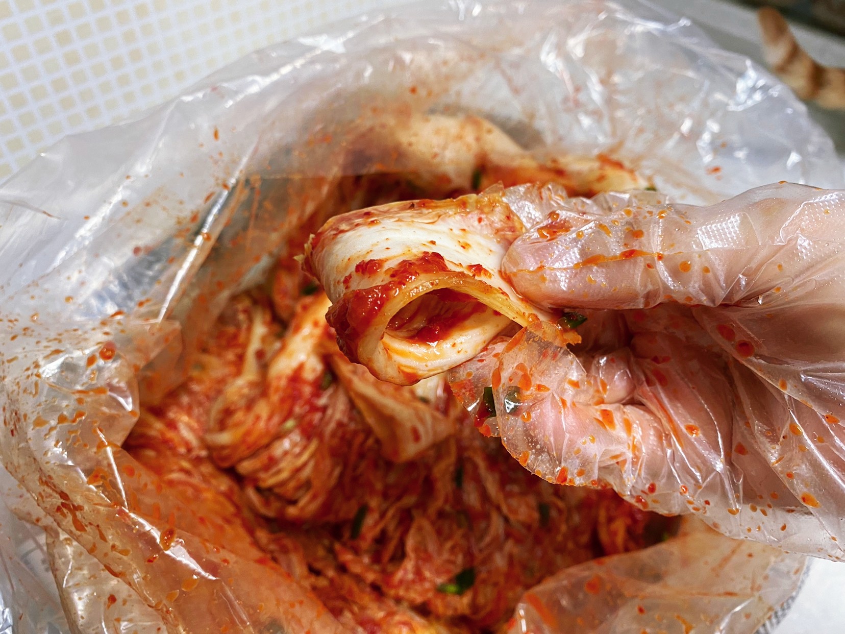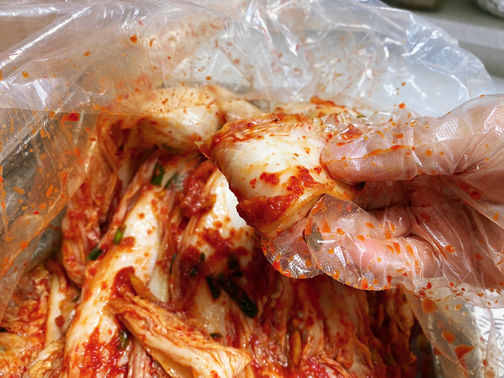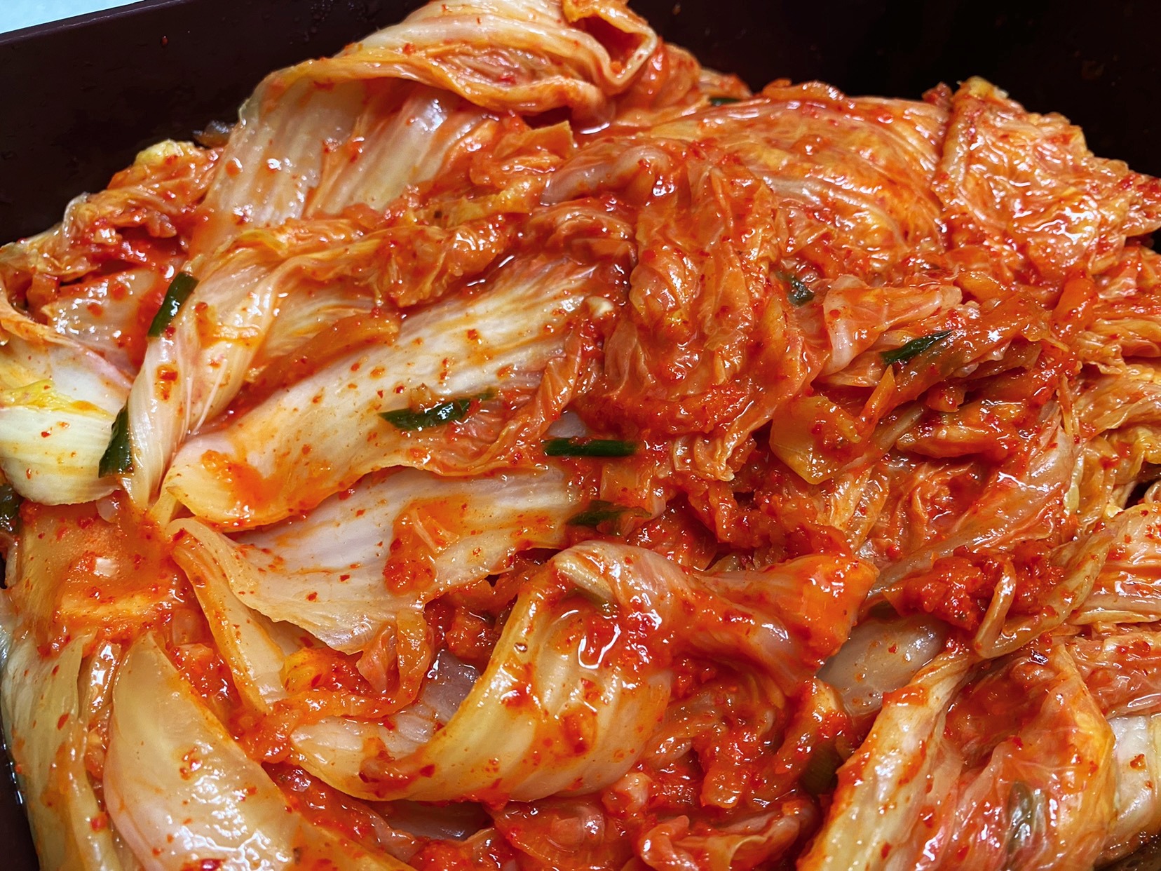 김치통에 옮겨 담기 전 맛보기